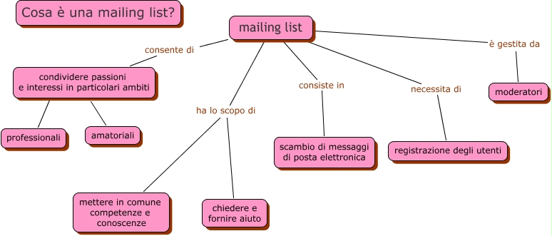 mailing list, mailing list ha lo scopo di mettere in comune competenze e conoscenze, mailing list ha lo scopo di chiedere e fornire aiuto, condividere passioni e interessi in particolari ambiti ???? amatoriali, mailing list necessita di registrazione degli utenti, mailing list consiste in scambio di messaggi di posta elettronica, mailing list consente di condividere passioni e interessi in particolari ambiti, condividere passioni e interessi in particolari ambiti ???? professionali, mailing list è gestita da moderatori