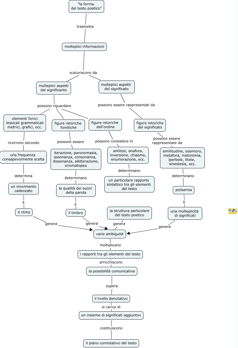 la poesia, la qualità dei suoni della parola è il timbro, similitudine, ossimoro, metafora, metonimia, iperbole, litote, sinestesia, ecc. determinano polisemia, figure retoriche del significato possono essere rappresentate da similitudine, ossimoro, metafora, metonimia, iperbole, litote, sinestesia, ecc., la struttura particolare del testo poetico genera varie ambiguità, molteplici aspetti del significante possono riguardare figure retoriche fonetiche, la possibilità comunicativa supera il livello denotativo, molteplici aspetti del significante possono riguardare elementi fonici lessicali grammaticali metrici, grafici, ecc., antitesi, anafora, inversione, chiasmo, enumerazione, ecc. determinano un particolare rapporto sintattico tra gli elementi del testo, un movimento cadenzato è il ritmo, polisemia è una molteplicità di significati