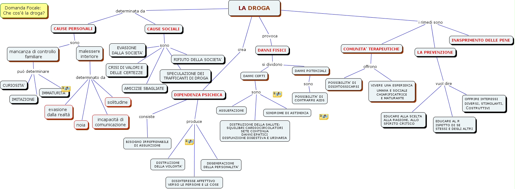 LA DROGA ESERCITAZIONE, CAUSE PERSONALI sono mancanza di controllo familiare, DANNI CERTI sono DISTRUZIONE DELLA SALUTE: SQUILIBRI CARDIOCIRCOLATORI SETE CONTINUA DANNI EPATICI DISFUNZIONE DIGESTIVA E URINARIA, DANNI CERTI sono ASSUEFAZIONE, mancanza di controllo familiare può determinare CURIOSITA', COMUNITA' TERAPEUTICHE offrono VIVERE UNA ESPERIENZA UMANA E SOCIALE CHIARIFICATRICE E MATURANTE, DIPENDENZA PSICHICA consiste BISOGNO IRREFRENABILE DI ASSUNZIONE, DIPENDENZA PSICHICA produce DEGENERAZIONE DELLA PERSONALITA', malessere interiore determinato da noia, CAUSE SOCIALI sono RIFIUTO DELLA SOCIETA', COMUNITA' TERAPEUTICHE offrono POSSIBILITA' DI DISINTOSSICARSI