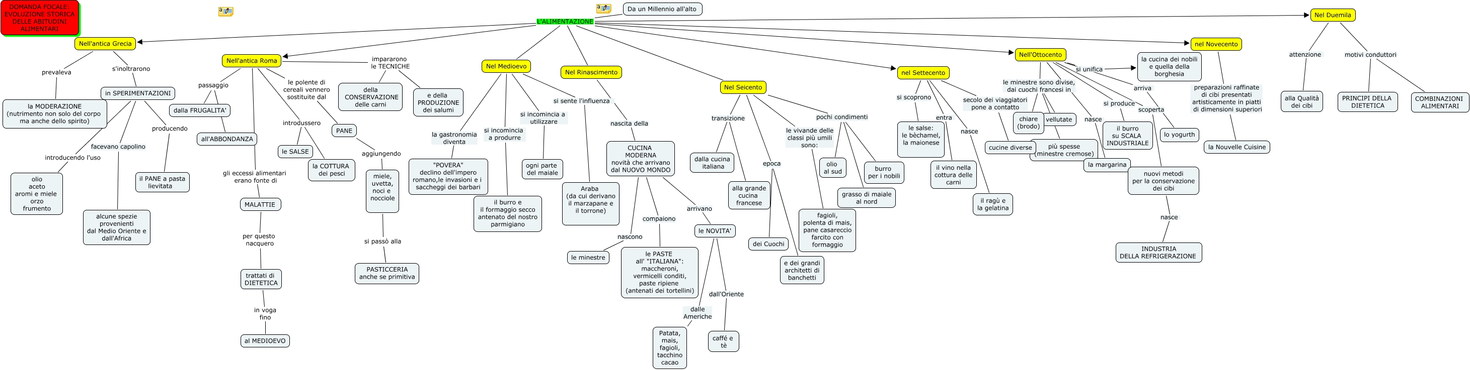 Storia dell'alimentazione prima mappa, Nell'antica Roma impararono le TECNICHE e della PRODUZIONE dei salumi, nel Settecento entra il vino nella cottura delle carni, Nel Seicento transizione dalla cucina italiana, Da un Millennio all'alto L'ALIMENTAZIONE Nell'Ottocento, Nel Medioevo la gastronomia diventa "POVERA" declino dell'impero romano,le invasioni e i saccheggi dei barbari, Nel Seicento pochi condimenti burro per i nobili, Nell'antica Roma passaggio dalla FRUGALITA', trattati di DIETETICA in voga fino al MEDIOEVO, Nel Duemila motivi conduttori COMBINAZIONI ALIMENTARI, Nell'Ottocento si unifica la cucina dei nobili e quella della borghesia