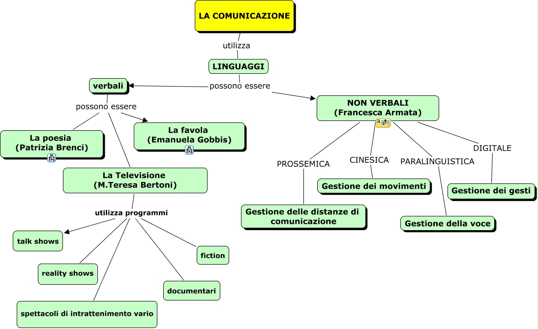 LA COMUNICAZIONE, verbali possono essere La favola (Emanuela Gobbis), LINGUAGGI possono essere NON VERBALI (Francesca Armata), LA COMUNICAZIONE utilizza LINGUAGGI, NON VERBALI (Francesca Armata) PARALINGUISTICA Gestione della voce, NON VERBALI (Francesca Armata) DIGITALE Gestione dei gesti, verbali possono essere La poesia (Patrizia Brenci), LINGUAGGI possono essere verbali, NON VERBALI (Francesca Armata) CINESICA Gestione dei movimenti, La Televisione (M.Teresa Bertoni) utilizza programmi fiction, verbali possono essere La Televisione (M.Teresa Bertoni)