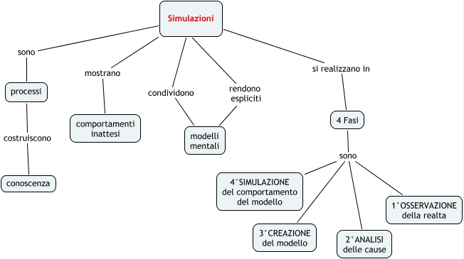 Simulazioni, comportamenti inattesi mostrano Simulazioni, Simulazioni si realizzano in 4 Fasi, modelli mentali condividono Simulazioni, 4°SIMULAZIONE del comportamento del modello sono 4 Fasi, processi sono Simulazioni, conoscenza costruiscono processi, 1°OSSERVAZIONE della realta sono 4 Fasi, 2°ANALISI delle cause sono 4 Fasi, modelli mentali rendono espliciti Simulazioni, 3°CREAZIONE del modello sono 4 Fasi