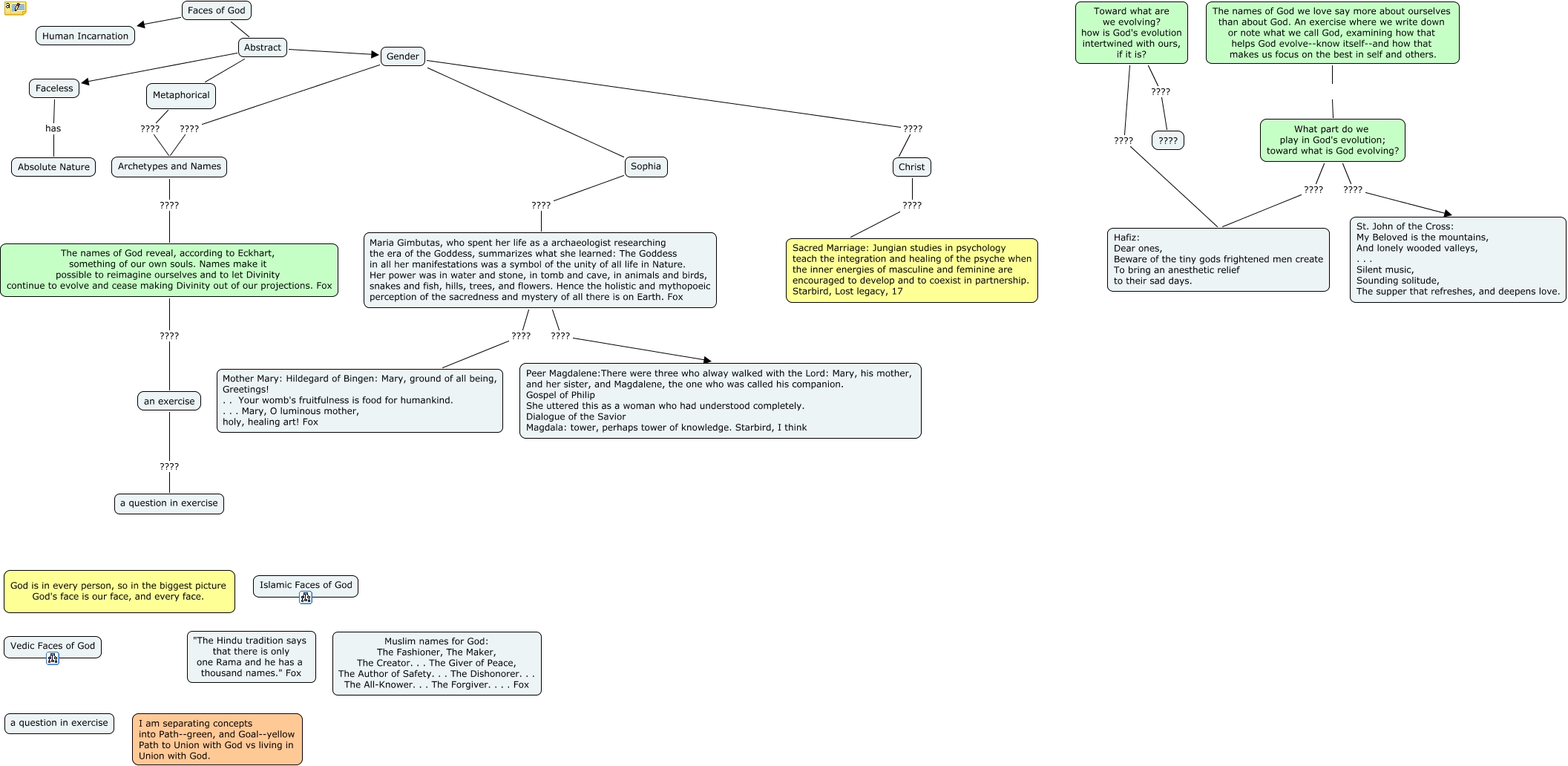 Faces of God, Gender Sophia, Sophia ???? Maria Gimbutas, who spent her life as a archaeologist researching the era of the Goddess, summarizes what she learned: The Goddess in all her manifestations was a symbol of the unity of all life in Nature. Her power was in water and stone, in tomb and cave, in animals and birds, snakes and fish, hills, trees, and flowers. Hence the holistic and mythopoeic perception of the sacredness and mystery of all there is on Earth. Fox, Abstract Metaphorical, Abstract Gender, Christ ???? Sacred Marriage: Jungian studies in psychology teach the integration and healing of the psyche when the inner energies of masculine and feminine are encouraged to develop and to coexist in partnership. Starbird, Lost legacy, 17, The names of God we love say more about ourselves than about God. An exercise where we write down or note what we call God, examining how that helps God evolve--know itself--and how that makes us focus on the best in self and others. What part do we play in God's evolution; toward what is God evolving?, Gender ???? Archetypes and Names, Faceless has Absolute Nature, The names of God reveal, according to Eckhart, something of our own souls. Names make it possible to reimagine ourselves and to let Divinity continue to evolve and cease making Divinity out of our projections. Fox ???? an exercise, Gender ???? Christ