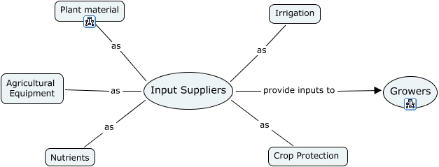 Input Suppliers chain, Input Suppliers as Crop Protection, Input Suppliers as Agricultural Equipment, Input Suppliers as Plant material, Input Suppliers provide inputs to Growers, Input Suppliers as Irrigation, Input Suppliers as Nutrients