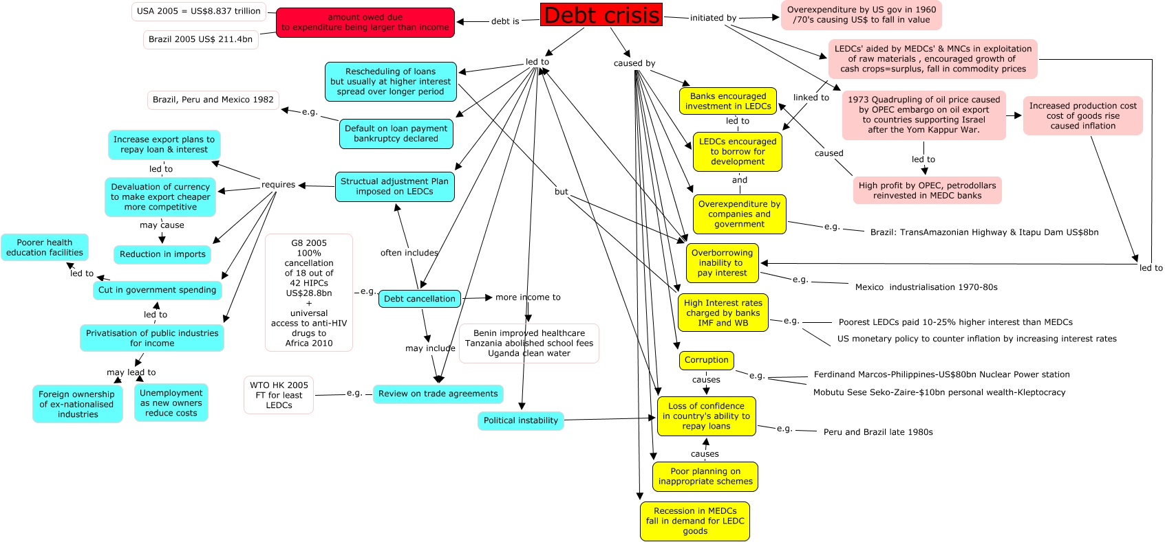 debt crisis, LEDCs encouraged to borrow for development and Overexpenditure by companies and government, 1973 Quadrupling of oil price caused by OPEC embargo on oil export to countries supporting Israel after the Yom Kappur War. Incre Increased production cost cost of goods rise caused inflation, Debt crisis led to Rescheduling of loans but usually at higher interest spread over longer period, High Interest rates charged by banks IMF and WB e.g. Poorest LEDCs paid 10-25% higher interest than MEDCs, Debt crisis led to Review on trade agreements, Structual adjustment Plan imposed on LEDCs requires Reduction in imports, High profit by OPEC, petrodollars reinvested in MEDC banks caused Banks encouraged investment in LEDCs, Structual adjustment Plan imposed on LEDCs requires Privatisation of public industries for income, Debt crisis initiated by Overexpenditure by US gov in 1960 /70's causing US$ to fall in value, amount owed due to expenditure being larger than income US USA 2005 = US$8.837 trillion