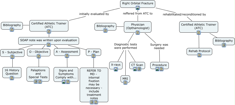 Orbital Fracture, SOAP note was written upon evaluation ???? S - Subjective, Certified Athletic Trainer (ATC) ???? SOAP note was written upon evaluation, Right Orbital Fracture initially evaluated by Certified Athletic Trainer (ATC), Certified Athletic Trainer (ATC) ???? Rehab Protocol, Certified Athletic Trainer (ATC) ???? Bibliography, S - Subjective ???? 16 History Question, Physician (Opthamologist) ???? Bibliography, Physician (Opthamologist) Diagnostic tests were performed MRI, Physician (Opthamologist) Diagnostic tests were performed X-rays, Right Orbital Fracture reffered from ATC to Physician (Opthamologist)