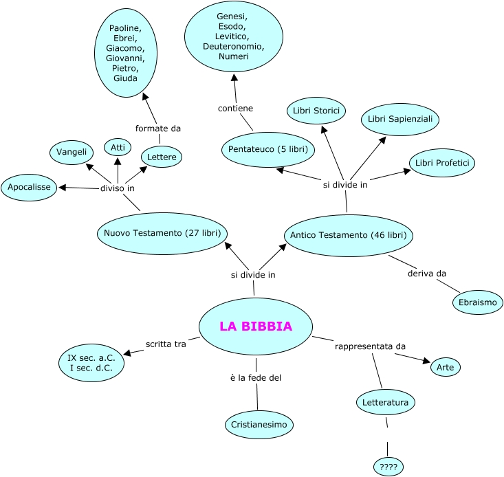 BIBBIA KIA-MARTA, Nuovo Testamento (27 libri) diviso in Vangeli, Antico Testamento (46 libri) si divide in Libri Storici, Antico Testamento (46 libri) si divide in Pentateuco (5 libri), LA BIBBIA rappresentata da Arte, LA BIBBIA è la fede del Cristianesimo, Lettere formate da Paoline, Ebrei, Giacomo, Giovanni, Pietro, Giuda, LA BIBBIA si divide in Antico Testamento (46 libri), LA BIBBIA rappresentata da Letteratura, Antico Testamento (46 libri) deriva da Ebraismo, Letteratura ????