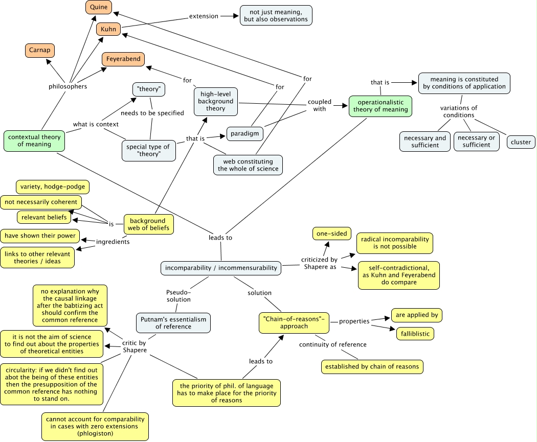shapere-evolution_and_continuity_in_scientific_change, "Chain-of-reasons"- approach properties falliblistic, Kuhn extension not just meaning, but also observations, special type of "theory" that is high-level background theory, incomparability / incommensurability Pseudo- solution Putnam's essentialism of reference, background web of beliefs is relevant beliefs, "Chain-of-reasons"- approach properties are applied by, Putnam's essentialism of reference critic by Shapere cannot account for comparability in cases with zero extensions (phlogiston), operationalistic theory of meaning that is meaning is constituted by conditions of application, contextual theory of meaning philosophers Carnap, web constituting the whole of science for Quine