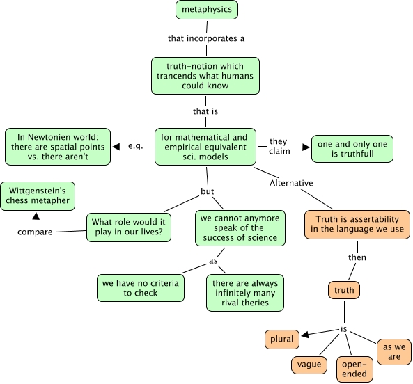 putnam-three_kinds_of_scientific_realism_metaphysics, truth is plural, What role would it play in our lives? compare Wittgenstein's chess metapher, for mathematical and empirical equivalent sci. models e.g. In Newtonien world: there are spatial points vs. there aren't, metaphysics that incorporates a truth-notion which trancends what humans could know, we cannot anymore speak of the success of science as we have no criteria to check, truth-notion which trancends what humans could know that is for mathematical and empirical equivalent sci. models, for mathematical and empirical equivalent sci. models Alternative Truth is assertability in the language we use, truth is as we are, for mathematical and empirical equivalent sci. models but we cannot anymore speak of the success of science, truth is open- ended