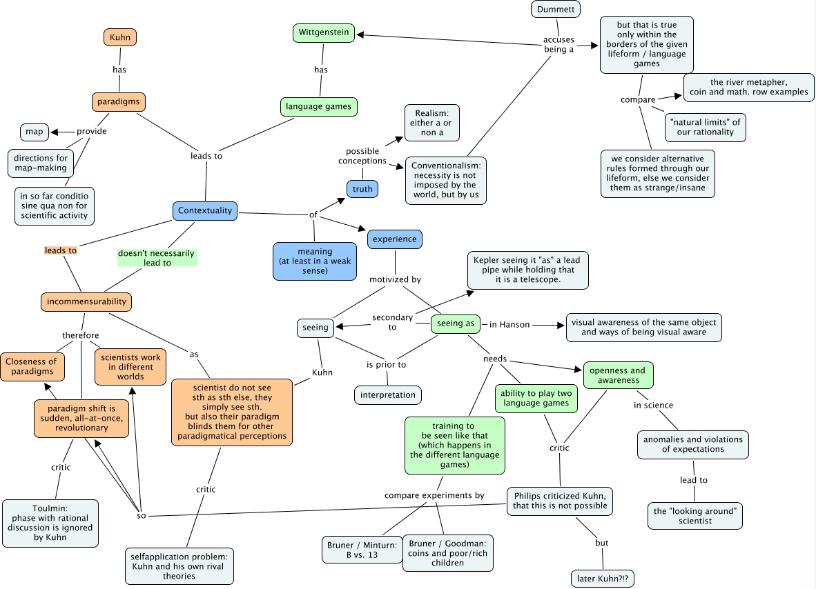 philips-paradigms_and_incommensurability, but that is true only within the borders of the given lifeform / language games compare we consider alternative rules formed through our lifeform, else we consider them as strange/insane, seeing as secondary to Kepler seeing it "as" a lead pipe while holding that it is a telescope., paradigms provide directions for map-making, seeing is prior to interpretation, incommensurability therefore scientists work in different worlds, paradigms provide map, Contextuality of meaning (at least in a weak sense), Contextuality of truth, but that is true only within the borders of the given lifeform / language games compare the river metapher, coin and math. row examples, incommensurability therefore paradigm shift is sudden, all-at-once, revolutionary