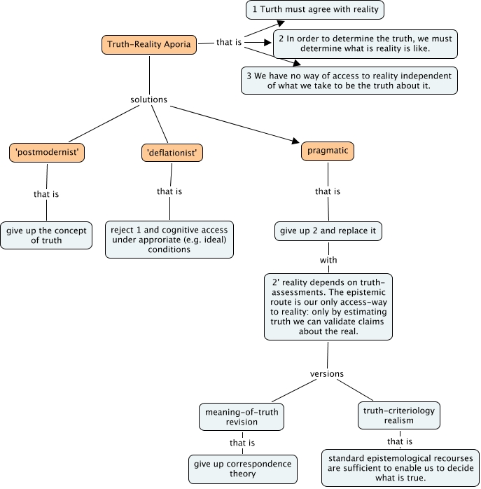 Rescher-knowledge_of_the_truth-truth_reality_aporia, give up 2 and replace it with 2' reality depends on truth- assessments. The epistemic route is our only access-way to reality: only by estimating truth we can validate claims about the real., Truth-Reality Aporia solutions pragmatic, 2' reality depends on truth- assessments. The epistemic route is our only access-way to reality: only by estimating truth we can validate claims about the real. versions meaning-of-truth revision, Truth-Reality Aporia solutions 'deflationist', Truth-Reality Aporia solutions 'postmodernist', Truth-Reality Aporia that is 2 In order to determine the truth, we must determine what is reality is like., meaning-of-truth revision that is give up correspondence theory, pragmatic that is give up 2 and replace it, Truth-Reality Aporia that is 1 Turth must agree with reality, Truth-Reality Aporia that is 3 We have no way of access to reality independent of what we take to be the truth about it.