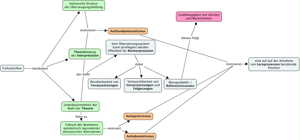 axel_müller_intro, holistische Struktur der Überzeugungsbildung motivieren Antifundamentalismus, Antifundamentalismus motivieren eine auf auf der Annahme von Lernprozessen beruhende Position, kein Übersetzungssystem kann privilegiert werden Offenheit für Reinterpretation dabei Revidierbarkeit von Voraussetzungen, Frühschriften beinhalten Theorieladung der Interpretation, Faktum des Bestehens epistemisch äquivalenter theoretischer Alternativen motiviert Antiabsolutismus, Unterbestimmtheit der Wahl der Theorie das heißt kein Übersetzungssystem kann privilegiert werden Offenheit für Reinterpretation, Antiabsolutismus motivieren eine auf auf der Annahme von Lernprozessen beruhende Position, Faktum des Bestehens epistemisch äquivalenter theoretischer Alternativen motiviert Antiapriorismus, kein Übersetzungssystem kann privilegiert werden Offenheit für Reinterpretation dabei Bezugsobjekt-/ Referenzinvarianz, Frühschriften beinhalten holistische Struktur der Überzeugungsbildung