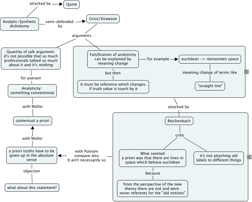 putnam-analytic_synthetic, Analytic-Synthetic dichotomy semi-defended by Grice/Strawson, Analyticity: something conventional with Müller contextual a priori, Grice/Strawson arguments Quantity of talk argument: it's not possible that so much professionals talked so much about it and it's nothing, a priori truths have to be given up in the absolute sense with Müller contextual a priori, Falsification of analyticity can be explained by meaning change but then it must be reference which changes, if truth value is touch by it, ???? attacked by Reichenbach, Reichenbach critic What seemed a priori was that there are lines in space which behave euclidean, Quantity of talk argument: it's not possible that so much professionals talked so much about it and it's nothing for putnam Analyticity: something conventional, euclidean -> riemannien space meaning change of terms like "straight line", Falsification of analyticity can be explained by meaning change for example euclidean -> riemannien space