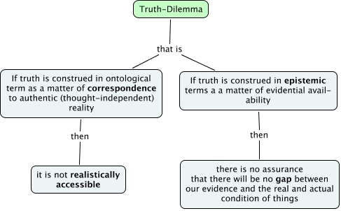 Rescher-knowledge_of_the_truth-truth_dilemma, Truth-Dilemma that is If truth is construed in epistemic terms a a matter of evidential avail- ability, Truth-Dilemma that is If truth is construed in ontological term as a matter of correspondence to authentic (thought-independent) reality, If truth is construed in epistemic terms a a matter of evidential avail- ability then there is no assurance that there will be no gap between our evidence and the real and actual condition of things, If truth is construed in ontological term as a matter of correspondence to authentic (thought-independent) reality then it is not realistically accessible