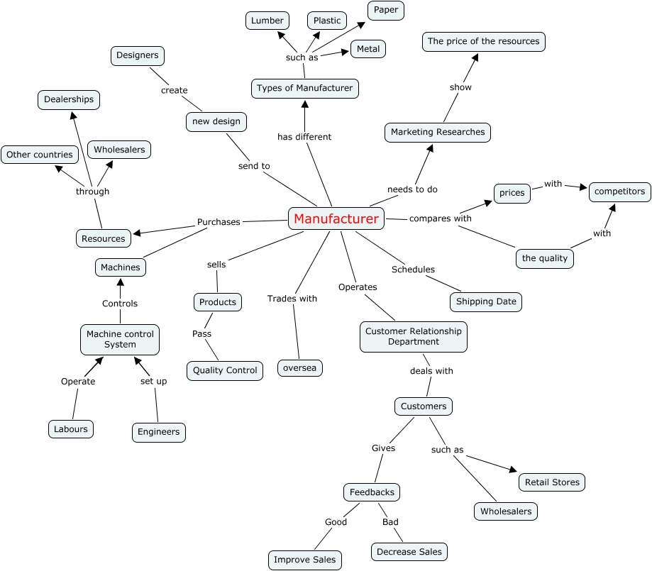 Manufacturing, Types of Manufacturer such as Plastic, Manufacturer Trades with oversea, Types of Manufacturer such as Paper, Manufacturer compares with prices, new design send to Manufacturer, Customers Gives Feedbacks, Manufacturer Operates Customer Relationship Department, Customers such as Retail Stores, Marketing Researches show The price of the resources, Manufacturer has different Types of Manufacturer
