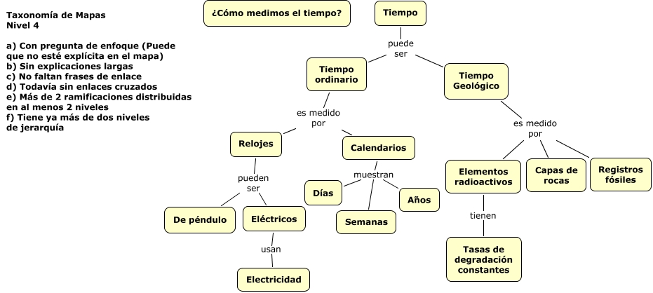 Taxonomía de Mapas, Nivel 4, Relojes pueden ser Eléctricos, Relojes pueden ser De péndulo, Tiempo Geológico es medido por Capas de rocas, Calendarios muestran Días, Tiempo puede ser Tiempo Geológico, Tiempo Geológico es medido por Registros fósiles, Tiempo ordinario es medido por Relojes, Tiempo ordinario es medido por Calendarios, Calendarios muestran Años, Tiempo puede ser Tiempo ordinario