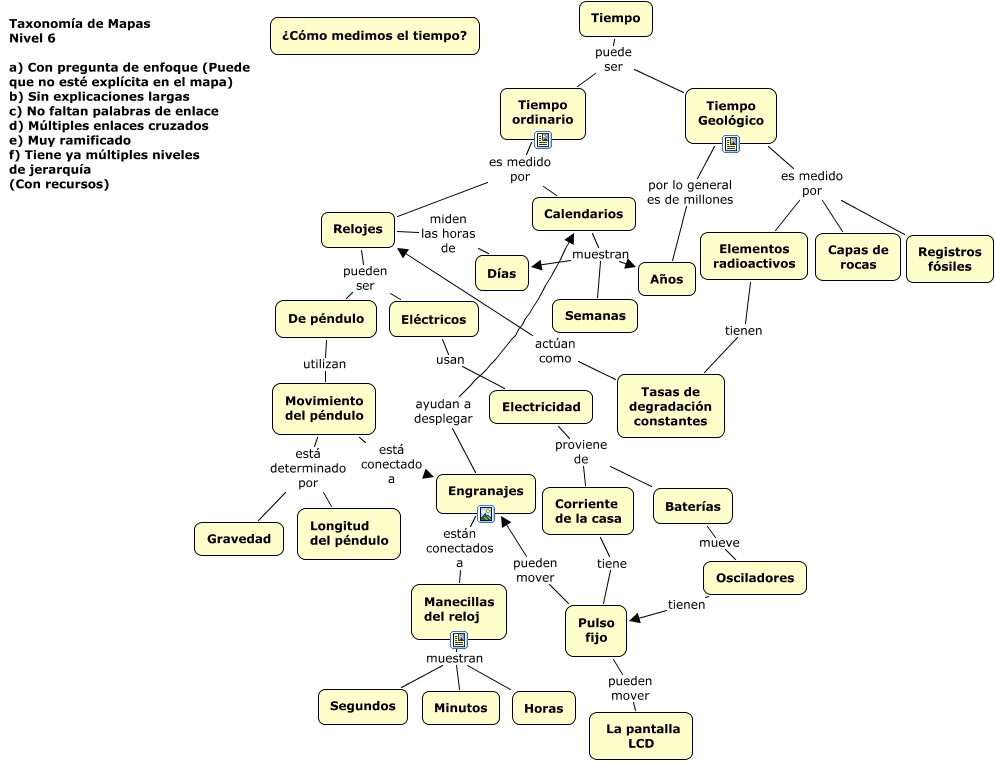 Taxonomía de Mapas, Nivel 6, Relojes miden las horas de Días, Tasas de degradación constantes actúan como Relojes, Tiempo Geológico por lo general es de millones Años, Tiempo puede ser Tiempo ordinario, Tiempo Geológico por lo general es de millones Años, Tiempo Geológico es medido por Capas de rocas, Calendarios muestran Años, Baterías mueve Osciladores, Elementos radioactivos tienen Tasas de degradación constantes, Tiempo puede ser Tiempo Geológico