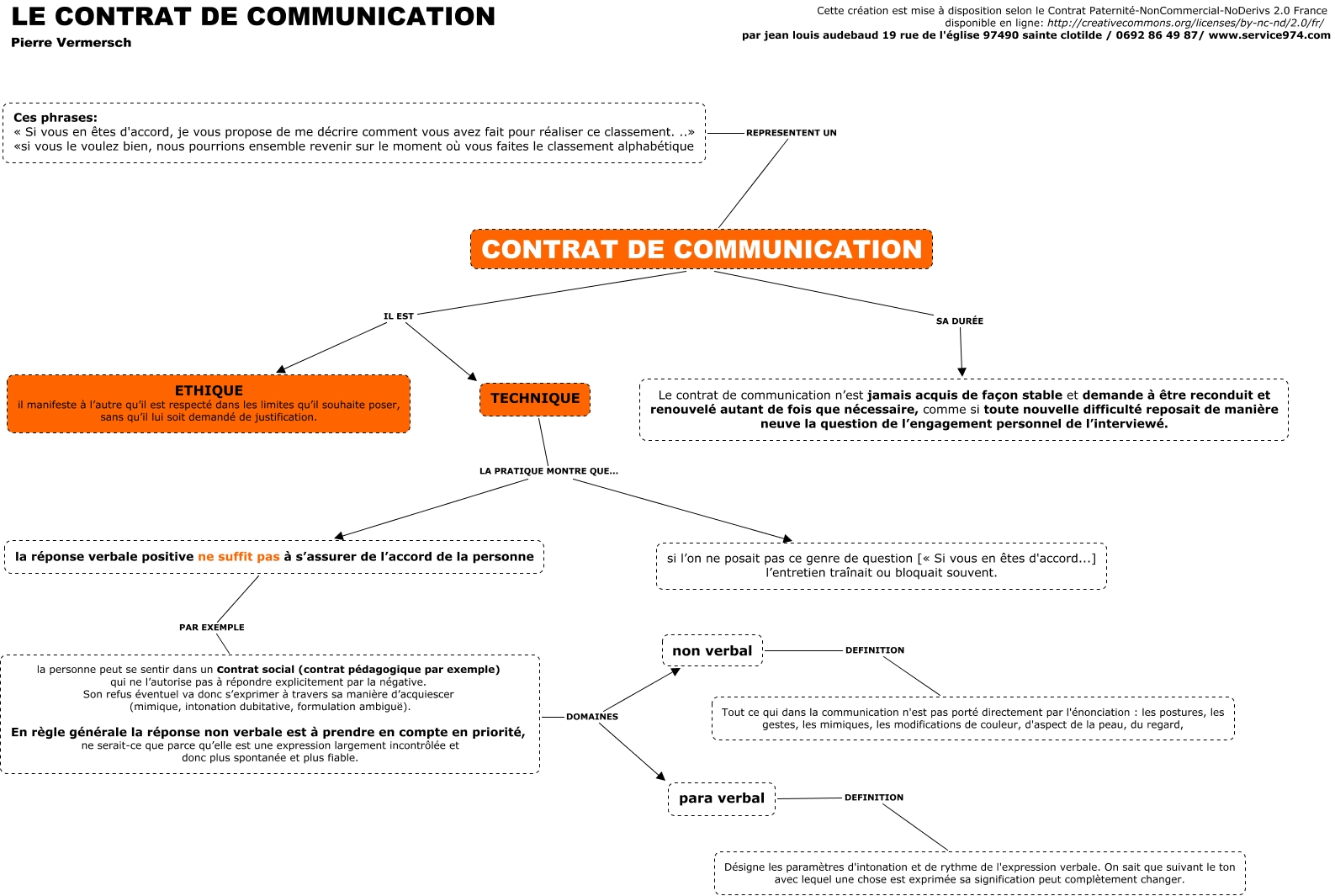 CONTRAT DE COMMUNICATION, para verbal DEFINITION Désigne les paramètres d'intonation et de rythme de l'expression verbale. On sait que suivant le ton avec lequel une chose est exprimée sa signification peut complètement changer., TECHNIQUE LA PRATIQUE MONTRE QUE... la réponse verbale positive ne suffit pas à s’assurer de l’accord de la personne, non verbal DEFINITION Tout ce qui dans la communication n'est pas porté directement par l'énonciation : les postures, les gestes, les mimiques, les modifications de couleur, d'aspect de la peau, du regard,, TECHNIQUE LA PRATIQUE MONTRE QUE... si l’on ne posait pas ce genre de question [« Si vous en êtes d'accord...] l’entretien traînait ou bloquait souvent., CONTRAT DE COMMUNICATION IL EST TECHNIQUE, CONTRAT DE COMMUNICATION IL EST ETHIQUE il manifeste à l’autre qu’il est respecté dans les limites qu’il souhaite poser, sans qu’il lui soit demandé de justification., Ces phrases: « Si vous en êtes d'accord, je vous propose de me décrire comment vous avez fait pour réaliser ce classement. ..» «si vous le voulez bien, nous pourrions ensemble revenir sur le moment où vous faites le classement alphabétique REPRESENTENT UN CONTRAT DE COMMUNICATION, CONTRAT DE COMMUNICATION SA DURÉE Le contrat de communication n’est jamais acquis de façon stable et demande à être reconduit et renouvelé autant de fois que nécessaire, comme si toute nouvelle difficulté reposait de manière neuve la question de l’engagement personnel de l’interviewé., la personne peut se sentir dans un contrat social (contrat pédagogique par exemple) qui ne l’autorise pas à répondre explicitement par la négative. Son refus éventuel va donc s’exprimer à travers sa manière d’acquiescer (mimique, intonation dubitative, formulation ambiguë). En règle générale la réponse non verbale est à prendre en compte en priorité, ne serait-ce que parce qu’elle est une expression largement incontrôlée et donc plus spontanée et plus fiable. DOMAINES non verbal, la personne peut se sentir dans un contrat social (contrat pédagogique par exemple) qui ne l’autorise pas à répondre explicitement par la négative. Son refus éventuel va donc s’exprimer à travers sa manière d’acquiescer (mimique, intonation dubitative, formulation ambiguë). En règle générale la réponse non verbale est à prendre en compte en priorité, ne serait-ce que parce qu’elle est une expression largement incontrôlée et donc plus spontanée et plus fiable. DOMAINES para verbal