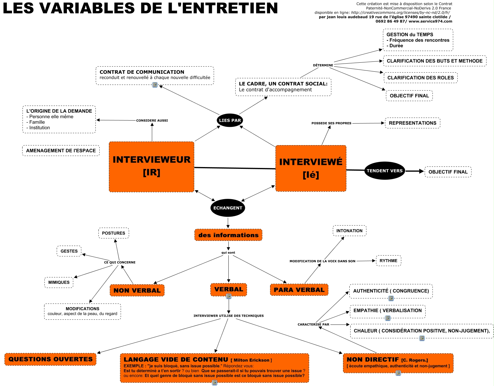 VARIABLE DE l ENTRETIENT, des informations qui sont VERBAL, INTERVIEWEUR [IR] ECHANGENT des informations, INTERVIEWEUR [IR] LIES PAR LE CADRE, UN CONTRAT SOCIAL: Le contrat d'accompagnement, INTERVIEWÉ [Ié] POSSEDE SES PROPRES REPRESENTATIONS, INTERVIEWEUR [IR] TENDENT VERS OBJECTIF FINAL, PARA VERBAL MODIFICATION DE LA VOIX DANS SON INTONATION, INTERVIEWEUR [IR] CONSIDERE AUSSI L'ORIGINE DE LA DEMANDE - Personne elle même - Famille - Institution, NON DIRECTIF [C. Rogers.] [ écoute empathique, authenticité et non-jugement ] CARACTERISE PAR AUTHENTICITÉ ( CONGRUENCE), NON DIRECTIF [C. Rogers.] [ écoute empathique, authenticité et non-jugement ] CARACTERISE PAR EMPATHIE ( VERBALISATION, INTERVIEWÉ [Ié] TENDENT VERS OBJECTIF FINAL