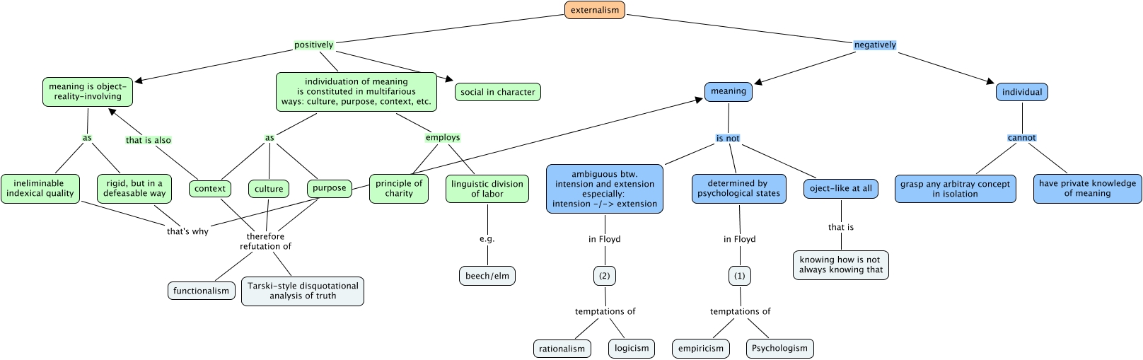 floyd-putnams_MoM, context therefore refutation of Tarski-style disquotational analysis of truth, (1) temptations of empiricism, externalism positively meaning is object- reality-involving, individuation of meaning is constituted in multifarious ways: culture, purpose, context, etc. employs linguistic division of labor, meaning is not oject-like at all, (2) temptations of logicism, context therefore refutation of functionalism, ambiguous btw. intension and extension especially: intension -/-> extension in Floyd (2), linguistic division of labor e.g. beech/elm, externalism positively individuation of meaning is constituted in multifarious ways: culture, purpose, context, etc.