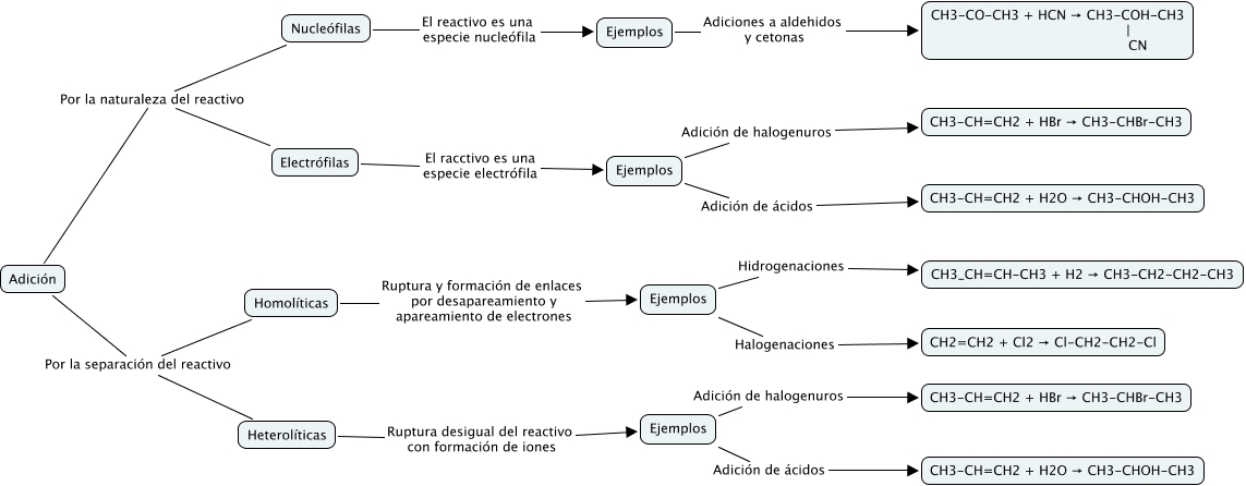 adicion, Heterolíticas Ruptura desigual del reactivo con formación de iones Ejemplos, Ejemplos Halogenaciones CH2=CH2 + Cl2 → Cl-CH2-CH2-Cl, Ejemplos Hidrogenaciones CH3_CH=CH-CH3 + H2 → CH3-CH2-CH2-CH3, Ejemplos Adición de halogenuros CH3-CH=CH2 + HBr → CH3-CHBr-CH3, Nucleófilas El reactivo es una especie nucleófila Ejemplos, Homolíticas Ruptura y formación de enlaces por desapareamiento y apareamiento de electrones Ejemplos, Ejemplos Adición de ácidos CH3-CH=CH2 + H2O → CH3-CHOH-CH3, Ejemplos Adición de halogenuros CH3-CH=CH2 + HBr → CH3-CHBr-CH3, Ejemplos Adición de ácidos CH3-CH=CH2 + H2O → CH3-CHOH-CH3, Ejemplos Adiciones a aldehidos y cetonas CH3-CO-CH3 + HCN → CH3-COH-CH3 | CN