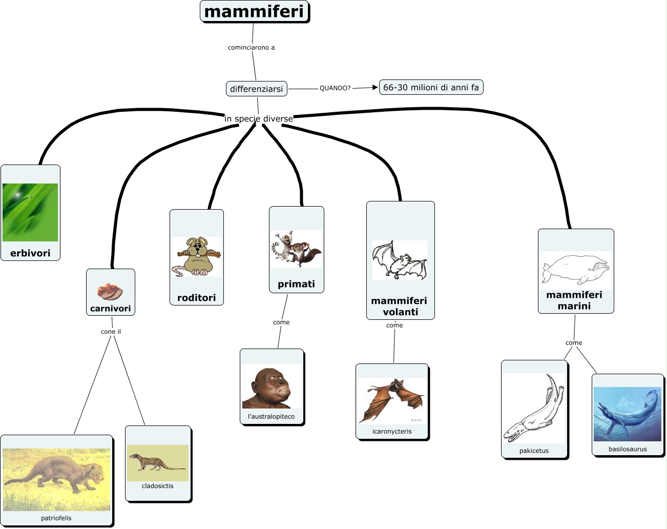 iiiiiiii, mammiferi marini come basilosaurus, carnivori cone il cladosictis, differenziarsi in specie diverse mammiferi volanti, mammiferi cominciarono a differenziarsi, differenziarsi in specie diverse erbivori, differenziarsi in specie diverse mammiferi marini, differenziarsi in specie diverse carnivori, mammiferi volanti come icaronycteris, carnivori cone il patriofelis, differenziarsi QUANDO? 66-30 milioni di anni fa