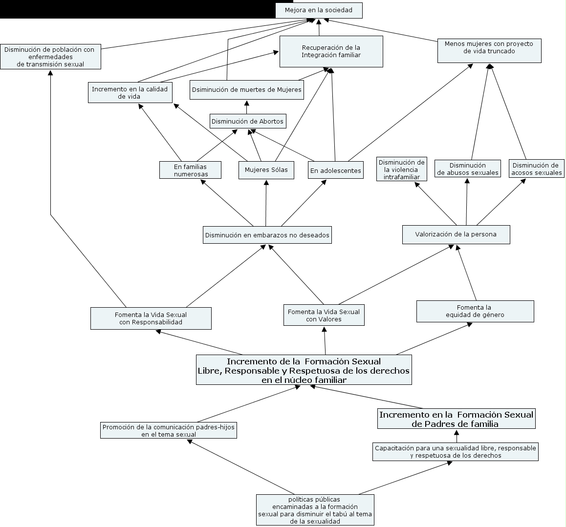 Formacion sexual arbol objetivos, En adolescentes contribuye a Menos mujeres con proyecto de vida truncado, Disminución de Abortos ???? Dsiminución de muertes de Mujeres, Valorización de la persona ???? Disminución de la violencia intrafamiliar, Incremento de la Formación Sexual Libre, Responsable y Respetuosa de los derechos en el núcleo familiar ???? Fomenta la Vida Sexual con Responsabilidad, Mujeres Sólas ???? Recuperación de la Integración familiar, Fomenta la Vida Sexual con Valores Genera Valorización de la persona, En adolescentes ???? Recuperación de la Integración familiar, Incremento en la calidad de vida ???? Recuperación de la Integración familiar, Disminución en embarazos no deseados ???? En familias numerosas, políticas públicas encaminadas a la formación sexual para disminuir el tabú al tema de la sexualidad ???? Promoción de la comunicación padres-hijos en el tema sexual