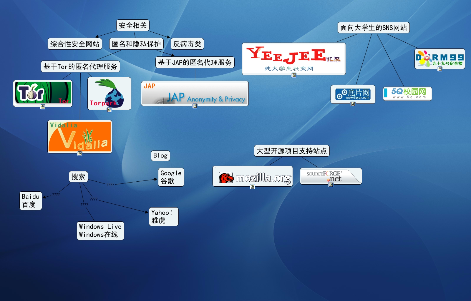 导航, 搜索 ???? Yahoo! 雅虎, 面向大学生的SNS网站 九十九号宿舍楼, 基于Tor的匿名代理服务 Torpark, 面向大学生的SNS网站 , 基于JAP的匿名代理服务 JAP, 面向大学生的SNS网站 , 安全相关 综合性安全网站, 基于Tor的匿名代理服务 Tor, 匿名和隐私保护 基于JAP的匿名代理服务, 大型开源项目支持站点