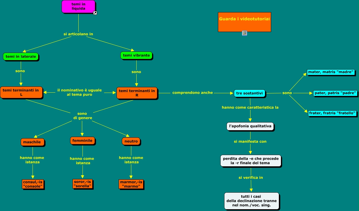 Temi in liquida della terza declinazione, tre sostantivi sono pater, patris "padre", femminile hanno come istanza soror,-is "sorella", temi terminanti in L sono di genere neutro, l'apofonia qualitativa si manifesta con perdita della -e che precede la -r finale del tema, tre sostantivi sono frater, fratris "fratello", temi terminanti in R comprendono anche tre sostantivi, maschile hanno come istanza consul,-is "console", temi terminanti in L sono di genere maschile, temi in laterale sono temi terminanti in L, temi terminanti in R sono di genere femminile