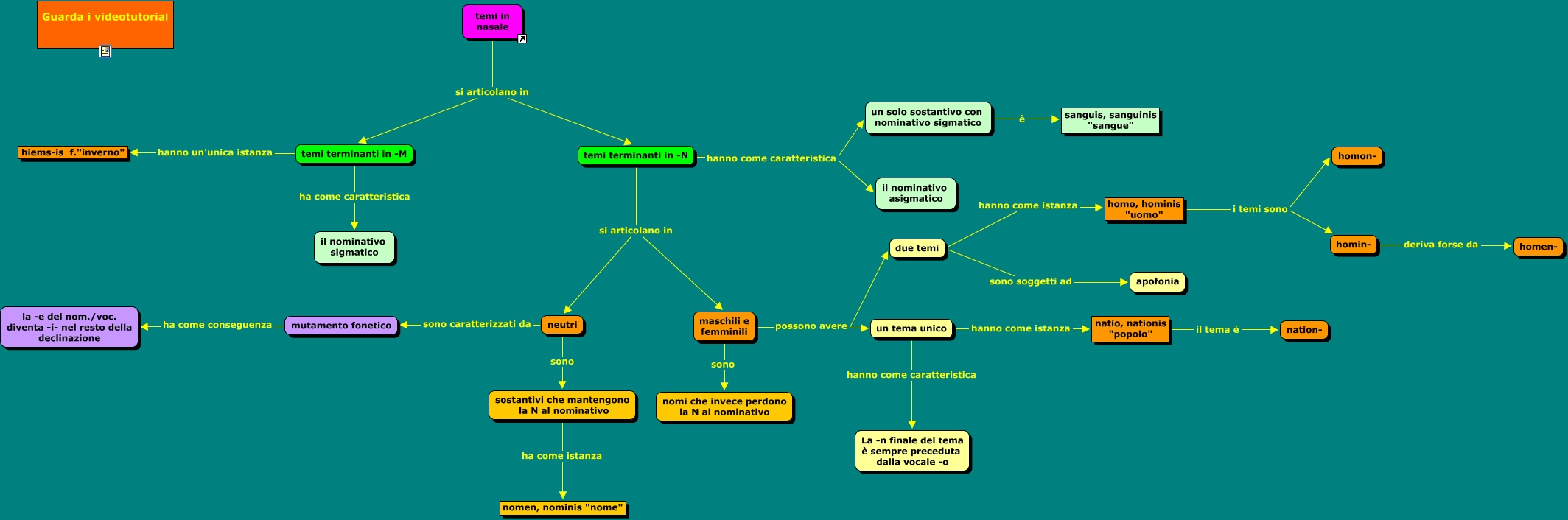 Temi in nasale della terza declinazione, neutri sono sostantivi che mantengono la N al nominativo, un tema unico hanno come caratteristica La -n finale del tema è sempre preceduta dalla vocale -o, temi terminanti in -M ha come caratteristica il nominativo sigmatico, maschili e femminili possono avere due temi, homo, hominis "uomo" i temi sono homin-, temi terminanti in -N hanno come caratteristica il nominativo asigmatico, un tema unico hanno come istanza natio, nationis "popolo", maschili e femminili sono nomi che invece perdono la N al nominativo, neutri sono caratterizzati da mutamento fonetico, temi terminanti in -N si articolano in neutri