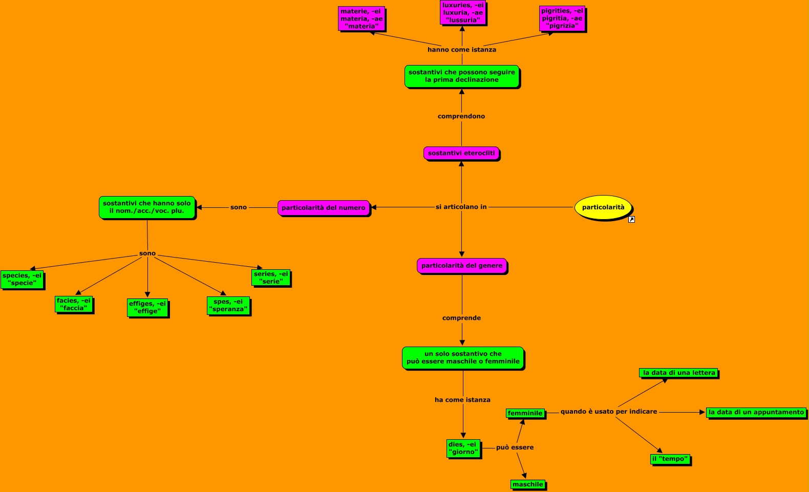 Particolarità quinta declinazione, sostantivi eterocliti comprendono sostantivi che possono seguire la prima declinazione, sostantivi che possono seguire la prima declinazione hanno come istanza pigrities, -ei pigritia, -ae "pigrizia", sostantivi che possono seguire la prima declinazione hanno come istanza luxuries, -ei luxuria, -ae "lussuria", particolarità del genere comprende un solo sostantivo che può essere maschile o femminile, sostantivi che hanno solo il nom./acc./voc. plu. sono series, -ei "serie", sostantivi che hanno solo il nom./acc./voc. plu. sono facies, -ei "faccia", femminile quando è usato per indicare il "tempo", dies, -ei "giorno" può essere maschile, particolarità si articolano in sostantivi eterocliti, particolarità del numero sono sostantivi che hanno solo il nom./acc./voc. plu.