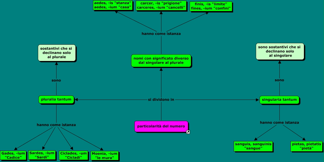 Particolarità del numero della terza declianzione, pluralia tantum hanno come istanza Moenia, -ium "le mura", singularia tantum sono sono sostantivi che si declinano solo al singolare, particolarità del numero si dividono in singularia tantum, pluralia tantum hanno come istanza Gades, -ium "Cadice", nomi con significato diverso dal singolare al plurale hanno come istanza finis, -is "limite" fines, -ium "confini", pluralia tantum hanno come istanza Ciclades, -um "Cicladi", singularia tantum hanno come istanza pietas, pietatis "pietà", nomi con significato diverso dal singolare al plurale hanno come istanza aedes, -is "stanza" aedes, -ium "casa", particolarità del numero si dividono in pluralia tantum, nomi con significato diverso dal singolare al plurale hanno come istanza carcer, -is "prigione" carceres, -ium "cancelli"