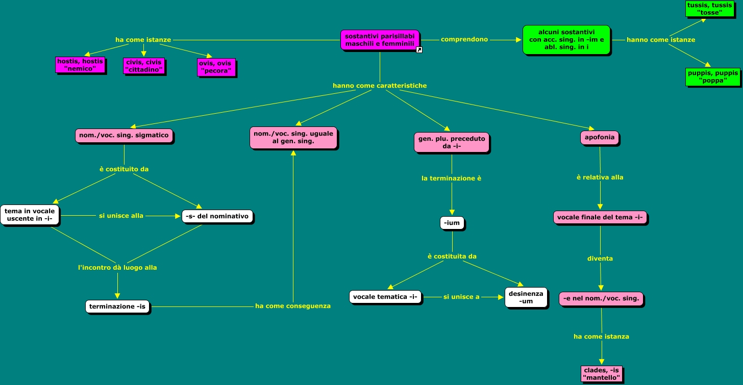Temi in vocale della terza declinazione - m.f. parisillabi, -ium è costituita da vocale tematica -i-, terminazione -is ha come conseguenza nom./voc. sing. uguale al gen. sing., sostantivi parisillabi maschili e femminili hanno come caratteristiche nom./voc. sing. sigmatico, sostantivi parisillabi maschili e femminili hanno come caratteristiche nom./voc. sing. uguale al gen. sing., tema in vocale uscente in -i- si unisce alla -s- del nominativo, -ium è costituita da desinenza -um, gen. plu. preceduto da -i- la terminazione è -ium, alcuni sostantivi con acc. sing. in -im e abl. sing. in i hanno come istanze puppis, puppis "poppa", -e nel nom./voc. sing. ha come istanza clades, -is "mantello", nom./voc. sing. sigmatico è costituito da tema in vocale uscente in -i-