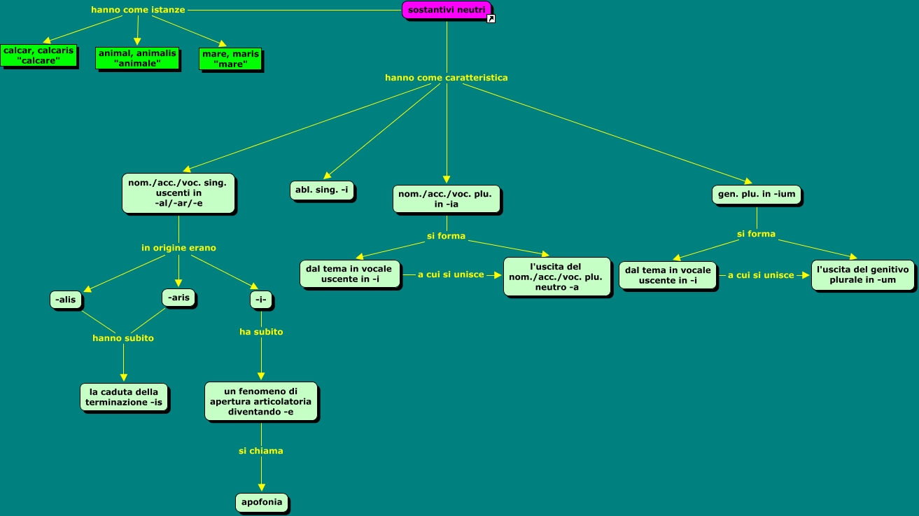 Temi in vocale della terza declinazione - neutri, gen. plu. in -ium si forma l'uscita del genitivo plurale in -um, dal tema in vocale uscente in -i a cui si unisce l'uscita del genitivo plurale in -um, nom./acc./voc. plu. in -ia si forma dal tema in vocale uscente in -i, sostantivi neutri hanno come caratteristica nom./acc./voc. sing. uscenti in -al/-ar/-e, un fenomeno di apertura articolatoria diventando -e si chiama apofonia, sostantivi neutri hanno come istanze animal, animalis "animale", dal tema in vocale uscente in -i a cui si unisce l'uscita del nom./acc./voc. plu. neutro -a, nom./acc./voc. sing. uscenti in -al/-ar/-e in origine erano -alis, -i- ha subito un fenomeno di apertura articolatoria diventando -e, nom./acc./voc. sing. uscenti in -al/-ar/-e in origine erano -aris