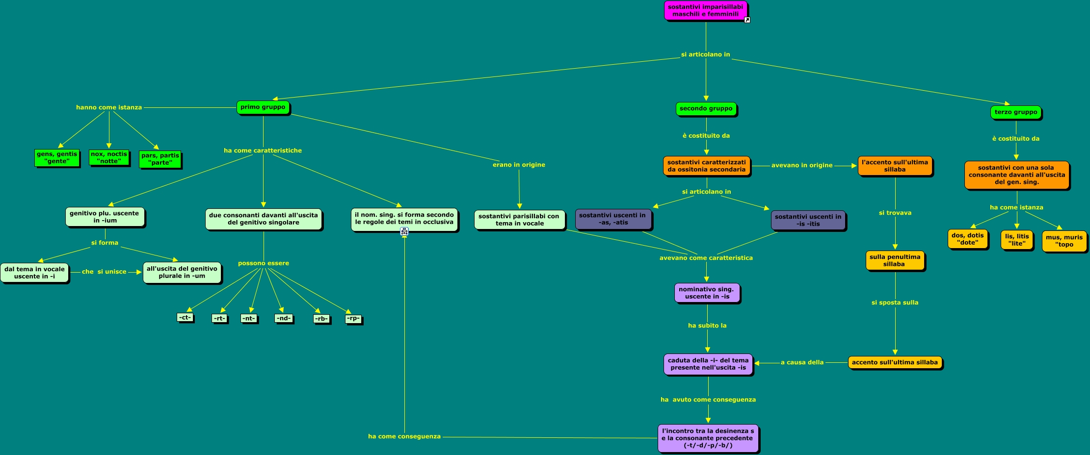 Temi in vocale della terza declinazione - m.f. imparisillabi, primo gruppo hanno come istanza nox, noctis "notte", sostantivi uscenti in -as, -atis avevano come caratteristica nominativo sing. uscente in -is, sostantivi caratterizzati da ossitonia secondaria si articolano in sostantivi uscenti in -as, -atis, sostantivi parisillabi con tema in vocale avevano come caratteristica nominativo sing. uscente in -is, dal tema in vocale uscente in -i che si unisce all'uscita del genitivo plurale in -um, sostantivi con una sola consonante davanti all'uscita del gen. sing. ha come istanza mus, muris "topo, due consonanti davanti all'uscita del genitivo singolare possono essere -nt-, primo gruppo hanno come istanza gens, gentis "gente", due consonanti davanti all'uscita del genitivo singolare possono essere -rb-, l'accento sull'ultima sillaba si trovava sulla penultima sillaba