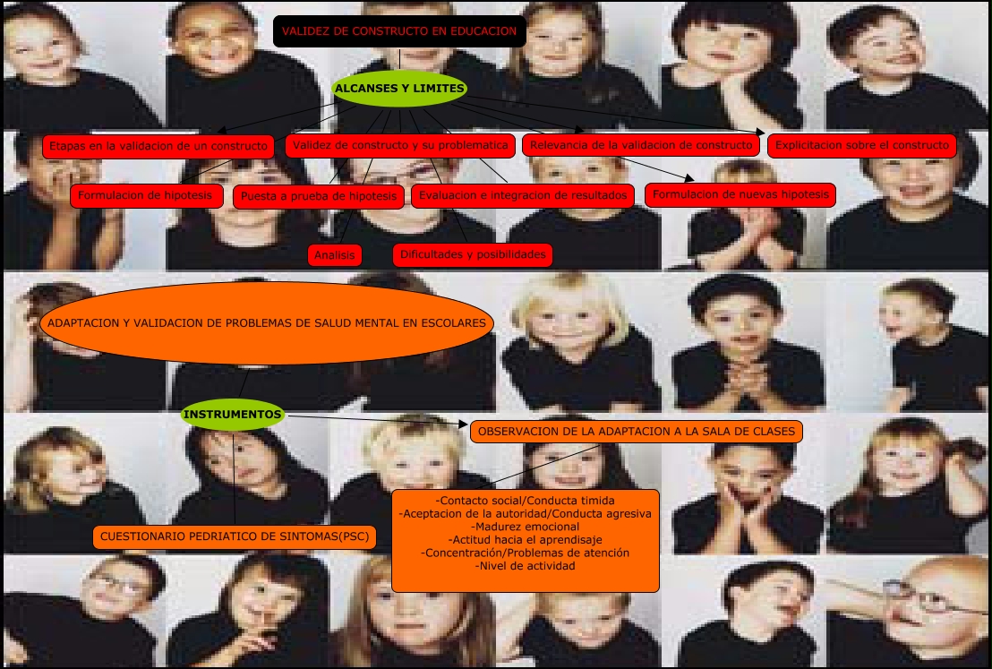 enfermedad mental, ADAPTACION Y VALIDACION DE PROBLEMAS DE SALUD MENTAL EN ESCOLARES INSTRUMENTOS OBSERVACION DE LA ADAPTACION A LA SALA DE CLASES, OBSERVACION DE LA ADAPTACION A LA SALA DE CLASES ???? -Contacto social/Conducta timida -Aceptacion de la autoridad/Conducta agresiva -Madurez emocional -Actitud hacia el aprendisaje -Concentración/Problemas de atención -Nivel de actividad, ADAPTACION Y VALIDACION DE PROBLEMAS DE SALUD MENTAL EN ESCOLARES INSTRUMENTOS CUESTIONARIO PEDRIATICO DE SINTOMAS(PSC), VALIDEZ DE CONSTRUCTO EN EDUCACION ALCANSES Y LIMITES Relevancia de la validacion de constructo, VALIDEZ DE CONSTRUCTO EN EDUCACION ALCANSES Y LIMITES Puesta a prueba de hipotesis, VALIDEZ DE CONSTRUCTO EN EDUCACION ALCANSES Y LIMITES Etapas en la validacion de un constructo, VALIDEZ DE CONSTRUCTO EN EDUCACION ALCANSES Y LIMITES Dificultades y posibilidades, VALIDEZ DE CONSTRUCTO EN EDUCACION ALCANSES Y LIMITES Analisis, VALIDEZ DE CONSTRUCTO EN EDUCACION ALCANSES Y LIMITES Formulacion de nuevas hipotesis, VALIDEZ DE CONSTRUCTO EN EDUCACION ALCANSES Y LIMITES Evaluacion e integracion de resultados