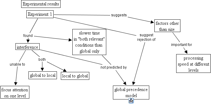 hoffman expt 1, slower time in "both relevant" conditions than global only not predicted by global precedence model, Experiment 1 suggests factors other than size, interference unable to focus attention on one level, Experiment 1 found interference, Experiment 1 suggest rejection of global precedence model, interference not predicted by global precedence model, factors other than size important for processing speed at different levels, Experiment 1 found slower time in "both relevant" conditions than global only, interference both global to local, interference both local to global