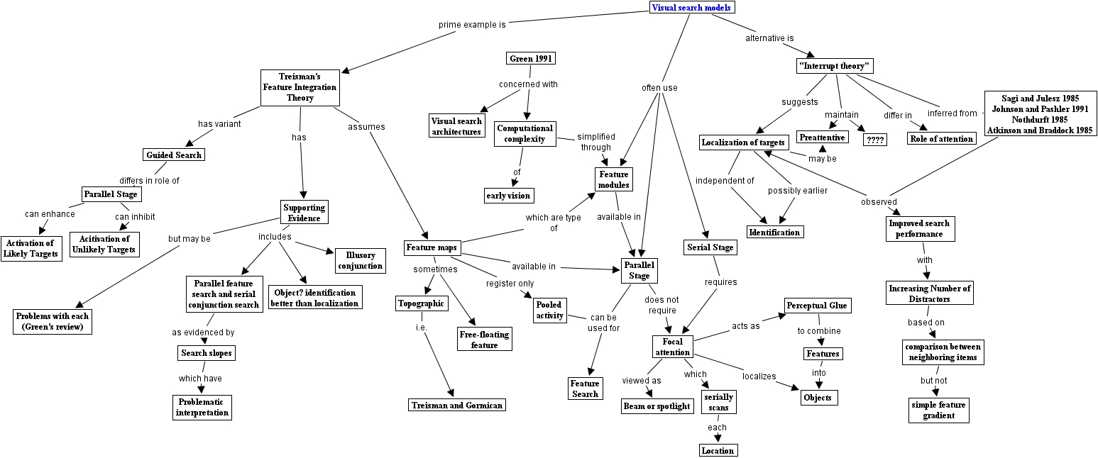 Green 1991, Improved search performance with Increasing Number of Distractors, Perceptual Glue to combine Features, Topographic i.e. Treisman and Gormican, Computational complexity of early vision, Supporting Evidence includes Parallel feature search and serial conjunction search, Parallel Stage can inhibit Acitivation of Unlikely Targets, Feature maps available in Parallel Stage, Localization of targets possibly earlier Identification, Increasing Number of Distractors based on comparison between neighboring items, Search slopes which have Problematic interpretation