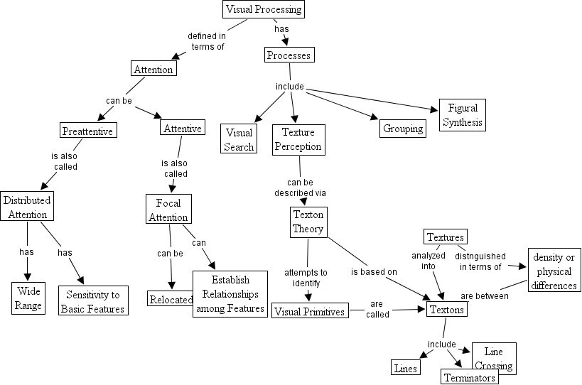 visual processing, Attention can be Preattentive, Textons include Lines, Attentive is also called Focal Attention, Visual Processing has Processes, density or physical differences are between Textons, Processes include Visual Search, Preattentive is also called Distributed Attention, Distributed Attention has Wide Range, Textures analyzed into Textons, Texton Theory attempts to identify Visual Primitives
