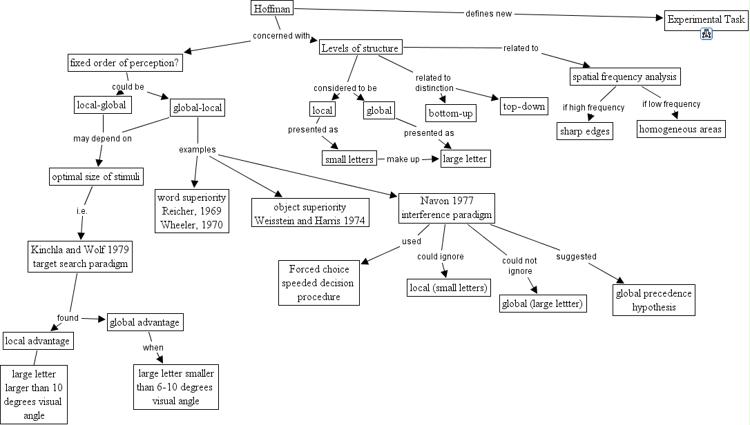 hoffman 1980 global local, fixed order of perception? could be global-local, global-local examples object superiority Weisstein and Harris 1974, optimal size of stimuli i.e. Kinchla and Wolf 1979 target search paradigm, Levels of structure related to distinction top-down, Navon 1977 interference paradigm used Forced choice speeded decision procedure, Navon 1977 interference paradigm could ignore local (small letters), Kinchla and Wolf 1979 target search paradigm found global advantage, spatial frequency analysis if high frequency sharp edges, global-local examples word superiority Reicher, 1969 Wheeler, 1970, Hoffman defines new Experimental Task