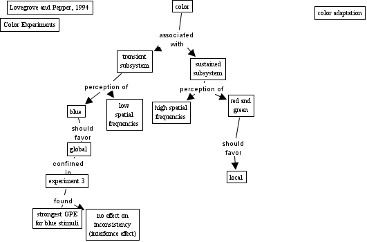 lovegrove color, blue should favor global, experiment 3 found strongest GPE for blue stimuli, experiment 3 found no effect on inconsistency (interfernce effect), sustained subsystem perception of high spatial frequencies, sustained subsystem perception of red and green, global confirned in experiment 3, red and green should favor local, transient subsystem perception of low spatial frequencies, color associated with transient subsystem, color associated with sustained subsystem