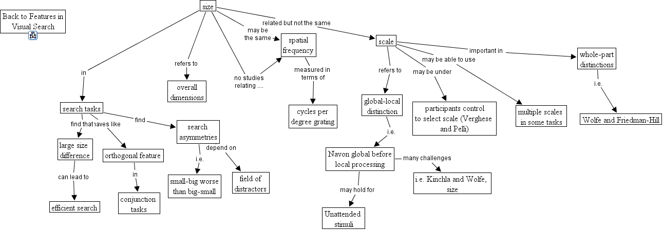 size_ spatial frequency and scale, size related but not the same scale, scale may be under participants control to select scale (Verghese and Pelli), scale may be able to use multiple scales in some tasks, large size difference can lead to efficient search, search tasks behaves like orthogonal feature, size no studies relating .... spatial frequency, size may be the same spatial frequency, size in search tasks, scale important in whole-part distinctions, Navon global before local processing many challenges i.e. Kinchla and Wolfe, size