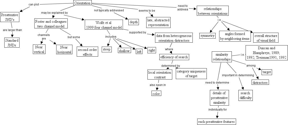 orientation as a feature in visual search, Preattentive JND's are larger than Standard JNDs, similarity relationships need to determine details of preattentive similarity, Foster and colleagues two channel model channels are Near horizontal, Foster and colleagues two channel model but some second order effects, similarity relationships among target, details of preattentive similarity individually for each preattentive features, similarity relationships among distractors, relationships between orientations i.e. angles formed by neighboring items, Orientation need to address relationships between orientations, similarity relationships important in determining search difficulty