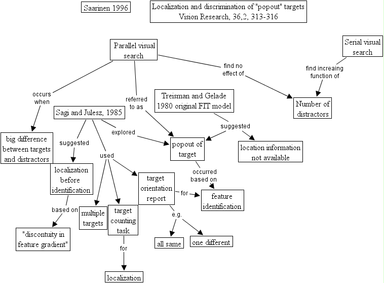 saarinen 1996, Serial visual search find increaing function of Number of distractors, Sagi and Julesz, 1985 explored popout of target, target counting task for localization, Treisman and Gelade 1980 original FIT model suggested popout of target, target orientation report e.g. all same, Sagi and Julesz, 1985 used multiple targets, Sagi and Julesz, 1985 used target counting task, Treisman and Gelade 1980 original FIT model suggested location information not available, localization before identification based on "discontuity in feature gradient", Parallel visual search occurs when big difference between targets and distractors