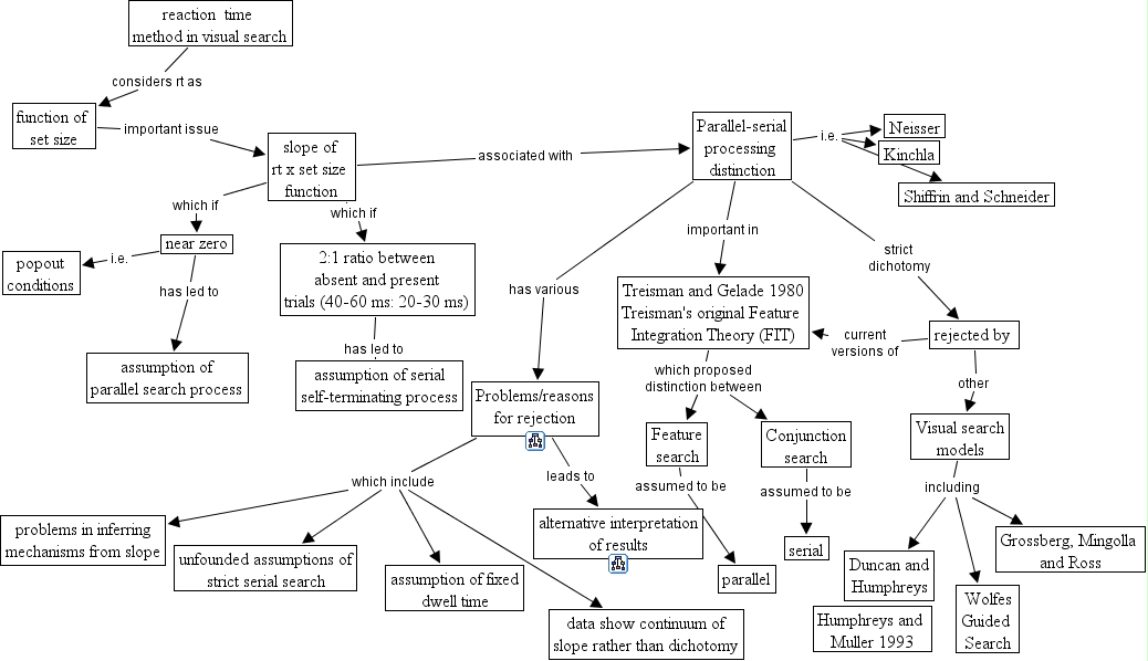 Reaction Time Method in Visual Search, reaction time method in visual search considers rt as function of set size, rejected by other Visual search models, Parallel-serial processing distinction important in Treisman and Gelade 1980 Treisman's original Feature Integration Theory (FIT), Conjunction search assumed to be serial, Problems/reasons for rejection which include assumption of fixed dwell time, slope of rt x set size function associated with Parallel-serial processing distinction, 2:1 ratio between absent and present trials (40-60 ms: 20-30 ms) has led to assumption of serial self-terminating process, Feature search assumed to be parallel, near zero has led to assumption of parallel search process, Treisman and Gelade 1980 Treisman's original Feature Integration Theory (FIT) which proposed distinction between Conjunction search