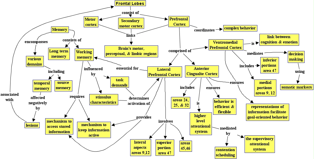 Gould2, Prefrontal Cortex links Brain's motor, perceptual, & limbic regions, higher level attentional system mediated by the supervisory attentional system, Ventromedial Prefrontal Cortex includes inferior portions area 47, Working memory requires mechanism to access stored information, Working memory influenced by task demands, Anterior Cingualte Cortex includes areas 24, 25, & 32, Frontal Lobes consist of Prefrontal Cortex, task demands determines activation of Lateral Prefrontal Cortex, Prefrontal Cortex comprised of Anterior Cingualte Cortex, Working memory influenced by stimulus characteristics