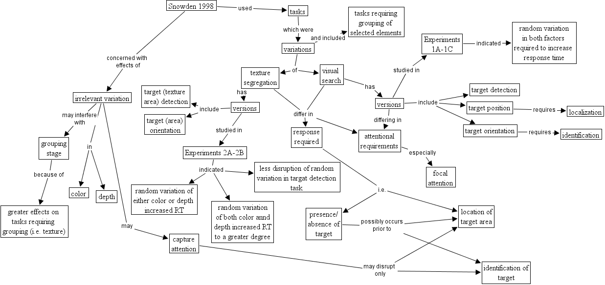 snowden 2, irrelevant variation may interfere with grouping stage, presence/ absence of target possibly occurs prior to identification of target, variations of texture segregation, versions studied in Experiments 2A-2B, response required i.e. presence/ absence of target, response required i.e. location of target area, visual search differ in attentional requirements, versions include target (texture area) detection, Experiments 2A-2B indicated random variation of both color annd depth increased RT to a greater degree, versions include target position