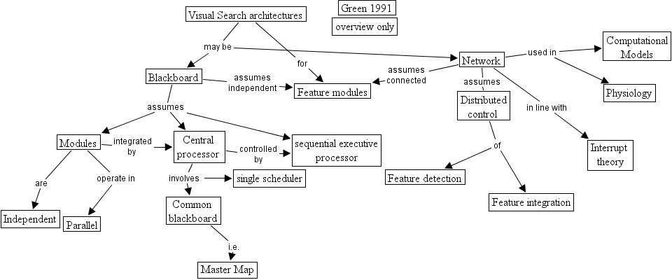 Green 2, Central processor involves Common blackboard, Modules integrated by Central processor, Network used in Computational Models, Visual Search architectures for Feature modules, Distributed control of Feature detection, Blackboard assumes sequential executive processor, Visual Search architectures may be Blackboard, Common blackboard i.e. Master Map, Visual Search architectures may be Network, Central processor controlled by sequential executive processor