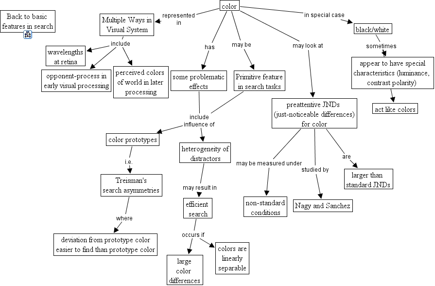 color as feature in search, preattentive JNDs (just-noticeable differences) for color studied by Nagy and Sanchez, Multiple Ways in Visual System include perceived colors of world in later processing, black/white sometimes act like colors, efficient search occurs if large color differences, Multiple Ways in Visual System include opponent-process in early visual processing, Primitive feature in search tasks include influence of heterogeneity of distractors, Multiple Ways in Visual System include wavelengths at retina, Treisman's search asymmetries where deviation from prototype color easier to find than prototype color, color may look at preattentive JNDs (just-noticeable differences) for color, color prototypes i.e. Treisman's search asymmetries