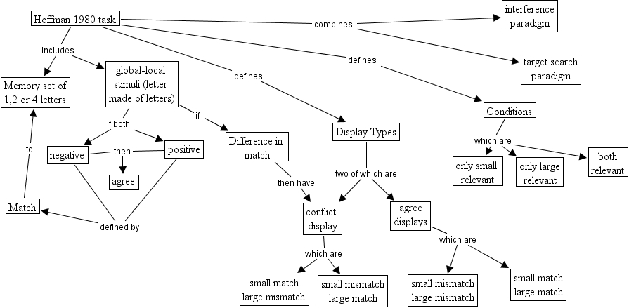 hoffmans experimental task, global-local stimuli (letter made of letters) if Difference in match, agree displays which are small match large match, Conditions which are both relevant, conflict display which are small match large mismatch, Match to Memory set of 1,2 or 4 letters, negative then agree, global-local stimuli (letter made of letters) if both positive, Hoffman 1980 task defines Conditions, positive defined by Match, positive then agree